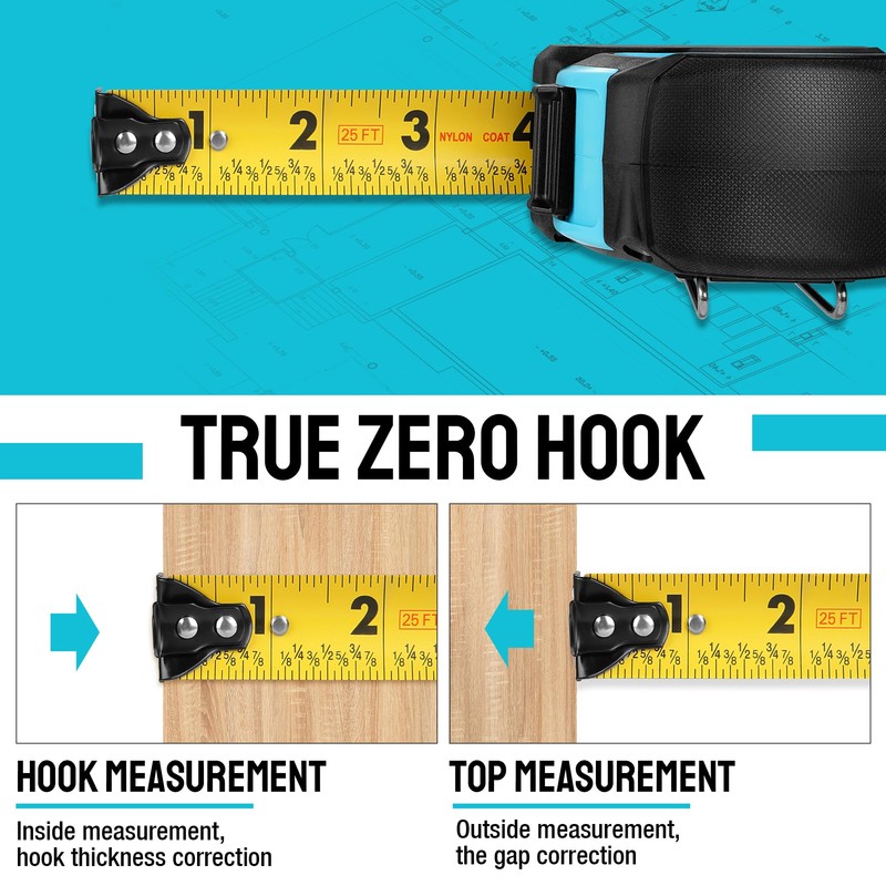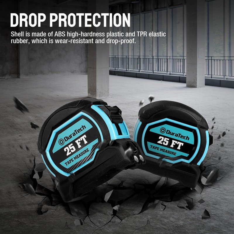 - 【MAKE MEASURING EASY】The easy read tape measure with metal buckle design and portable hanging lanyard is perfect for indoor and outdoor measurements. 7/8" blade width, easy to read 1/8 inch fractional marks, feet marks,triangle markings every 19.2" make DURATECH tape measure a perfect tool for engineer, builders, carpenters and more.