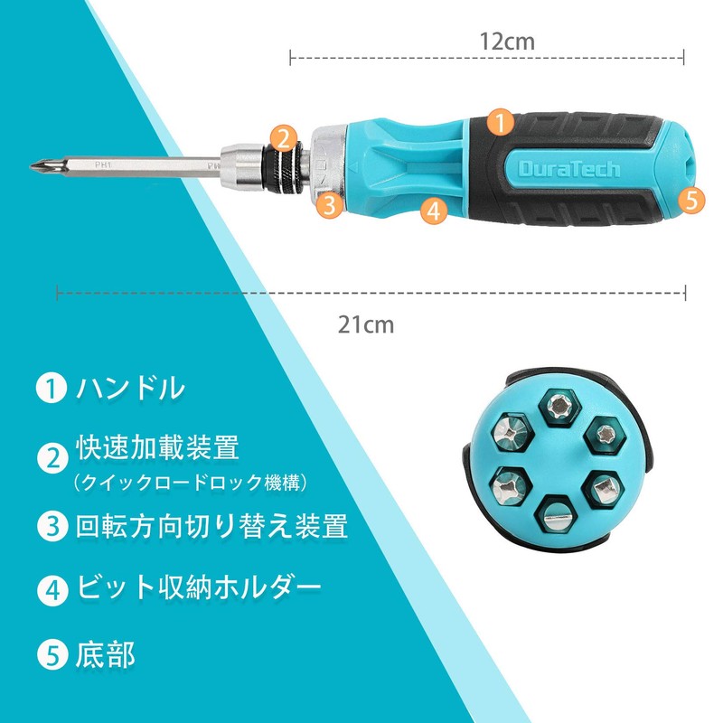 DURATECH Screwdriver Replacement Screwdriver Set 12-IN-1 Quick Release Ball Grip, Plus Negative Torx, Square, Ratchet Driver Bits, 6 Pieces, Furniture Assembly, Maintenance, Car Repair Tool