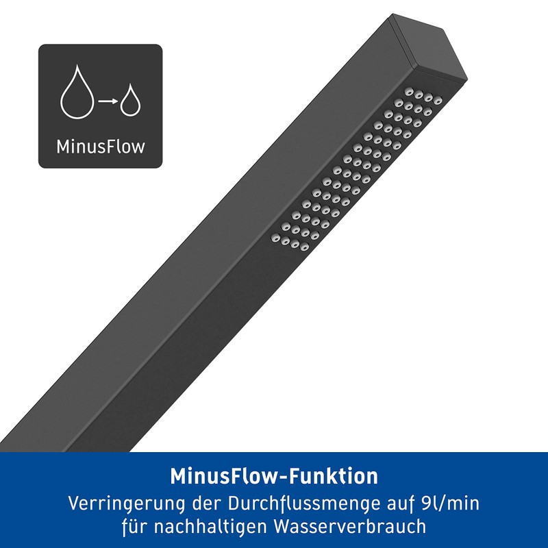 - Water-Saving MinusFlow function: reduce the flow rate to 9 l/min, which makes the shower head particularly water-saving. Compared to standard showers, you can save up to 40% water with the MinusFlow function.