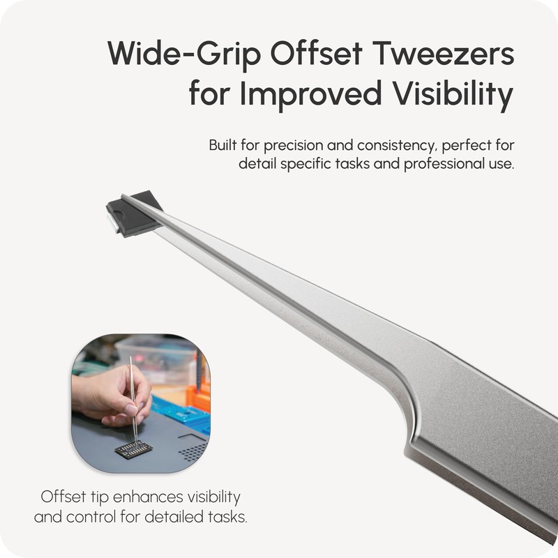 - High Quality Stainless Steel: Tough S2 alloy stainless steel offset wide-grip tweezers. Crafted from rust-resistant, wear-resistant stainless steel, our tips maintain precision and resist deformation, delivering enduring performance