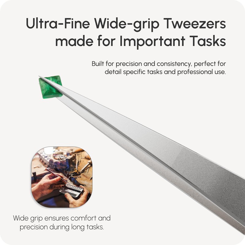 - Precision Tweezers: Ultra-fine wide-grip tweezers made for important tasks. Built for precision and consistency, perfect for detail specific tasks and professional use. Wide grip ensures comfort andprecision DURI ng long tasks