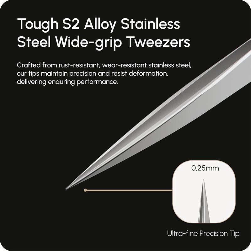 - High Quality Stainless Steel: Tough S2 alloy stainless steel wide-grip tweezers. Crafted from rust-resistant, wear-resistant stainless steel, our tips maintain precision and resist deformation, delivering enduring performance