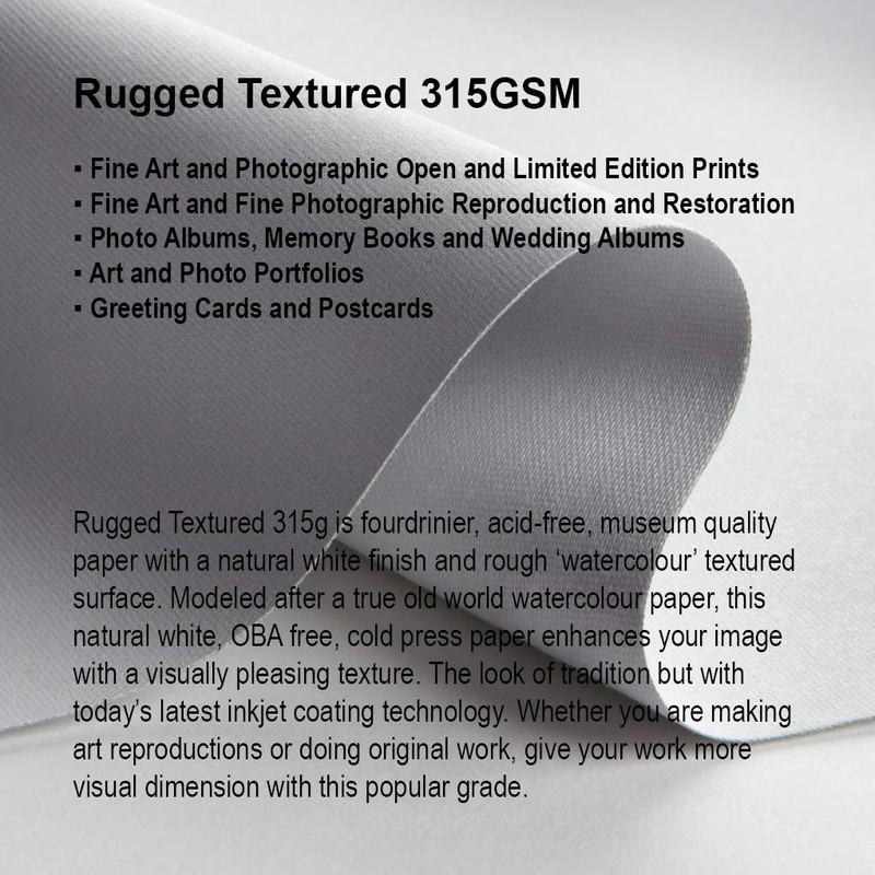 Rugged Textured 315g is fourdrinier, acid-free, museum quality paper with a natural white finish and rough ‘watercolour’ textured surface. Modeled after a true old world watercolour paper, this natural white, OBA free, cold press paper enhances your image with a visually pleasing texture. The look of tradition but with today’s latest inkjet coating technology. Whether you are making art reproductions or doing original work, give your work more visual dimension with this popular grade.