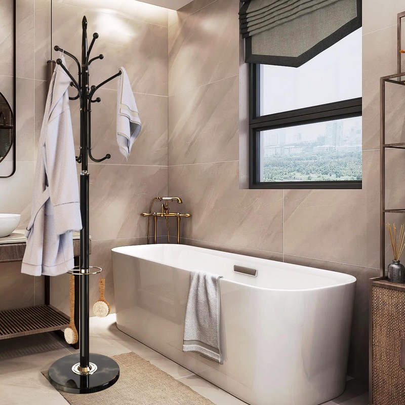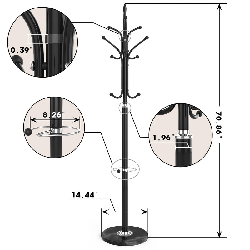 - 【Fashion and Practical coat rack】: The 14.44" diameter marble base provides a solid foundation with a maximum load capacity of 220lbs. The top of the coat rack has 12 hooks with smooth balls to prevent scratching clothes. There is enough space between each hook to ensure sufficient room for hanging more items.