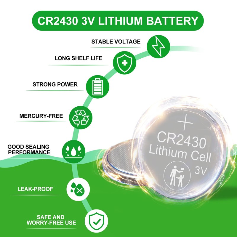- Long Lasting: CR2430 3-volt coin cell battery is tested under strict quality control standards. And CR2430 coin cell battery has CE certification, ensuring long lasting power and brings new life to your devices.