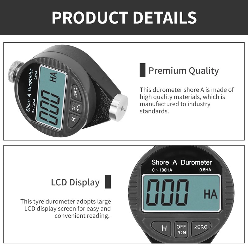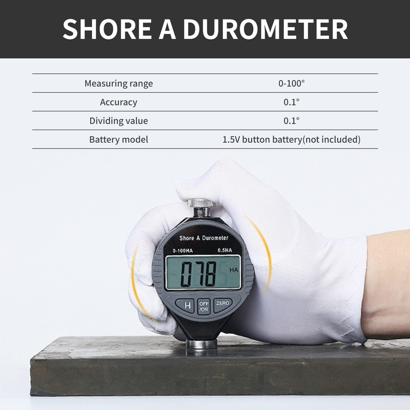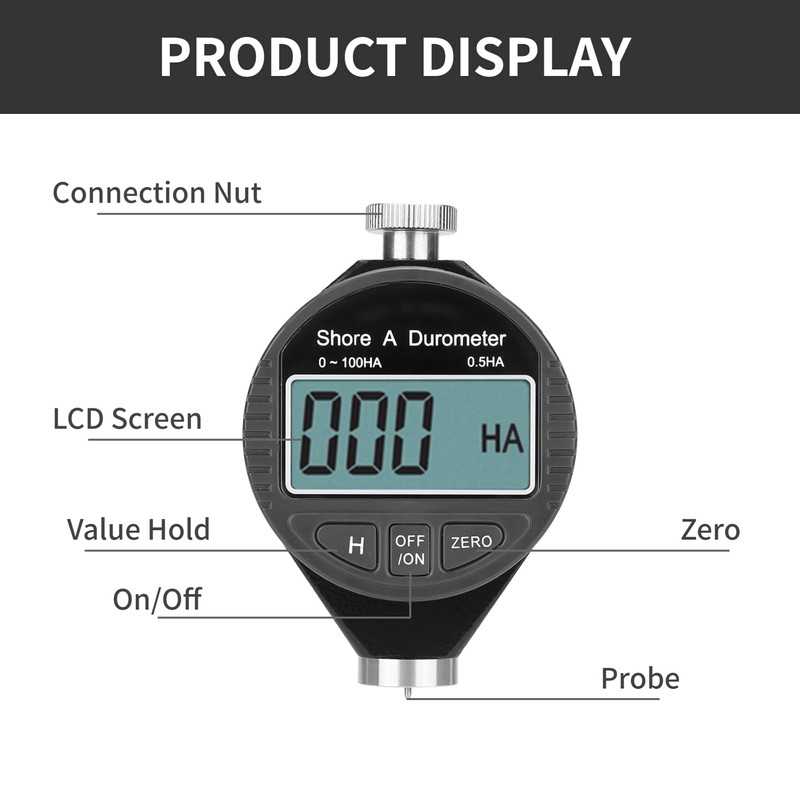 Es ampliamente utilizado para medir la dureza de varios materiales blandos como el caucho, gel de sílice, neumáticos y plástico. Con el interruptor de encendido, cambie la unidad de medida en cualquier posición, restablezca en cualquier posición Fácil de usar, medición precisa, fácil de transportar, duradero y estable, práctico y resistente. Pantalla LCD, fácil de leer grande Este probador de dureza es de tipo A, estándar industrial, alta precisión.