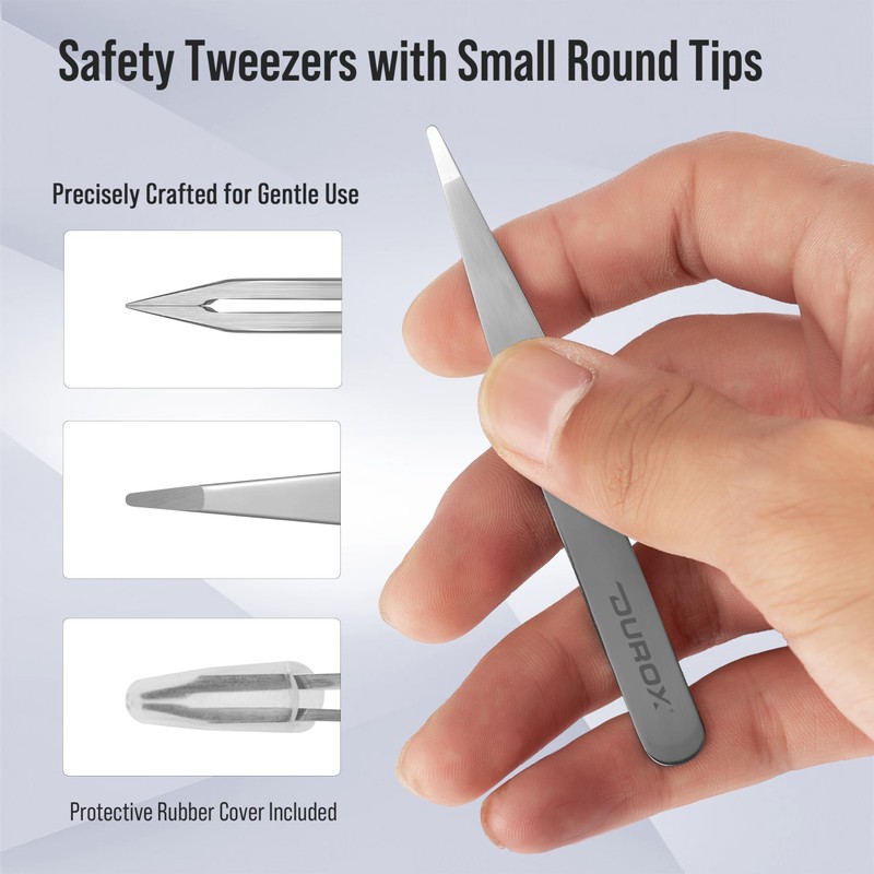 DUROX Blunt Tipped Safety Tweezers for Eyebrows, Chin, and Facial Hair. Precision tweezers for facial hair removal for women. Round tip tweezers for eyebrow shaping. Easily Remove Stray Beard