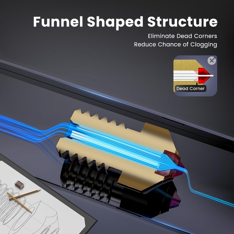 • Funnel Shaped Nozzle: DUROZZLE's Ruby nozzle is carefully cut and polished to have funnel shape structure. This will avoid accumulating material at the dead corners in this way to reduce risk of carbonization and nozzle blockage;