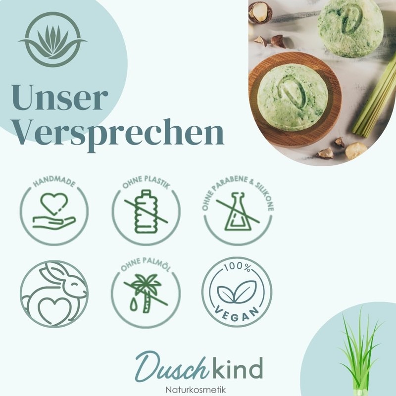 - The Duschkind solid shampoo soap natural cosmetics is suitable for every day. Whether shampoo, shower gel, shaving soap or conditioner. You only need one product, instead of four. You do something good for your skin and hair.