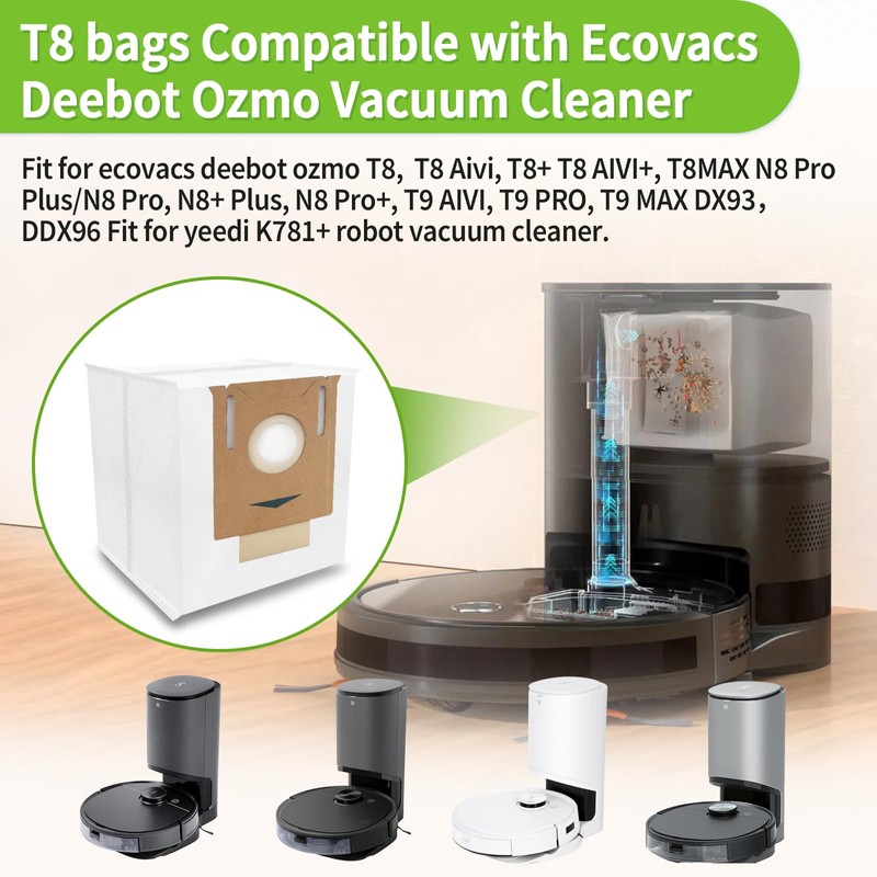• Perfect Compatibility: The T8 vacuum replacement bags compatible with Ecovacs Deebot Ozmo T8, T8 Aivi, T8+, T8 Aivi+, T8MAX, N8 Pro Plus, N8 Pro, N8+ Plus, N8 Pro+, T9 AIVI T9 PRO T9 MAX DX93, DDX96 dust bag, fit for Yeedi K781+ Robot Vacuum Cleaner, Not for Deebot T10+. Please confirm the device model of your machine before purchase.