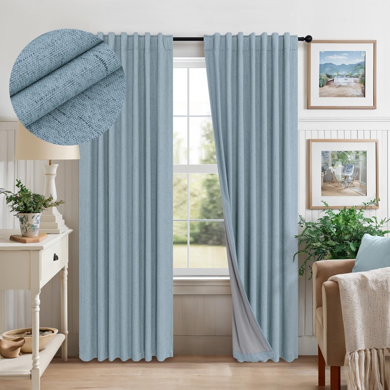 - 100% Blackout Curtains: A total blackout thermal coating layer is attached to the back of our faux linen curtains, blocking 100% of sun light and UV rays. Providing a completely dark environment for sleep and privacy. Good choice for bedroom, nursery room, kids room, living room, dining room, office, sliding glass door