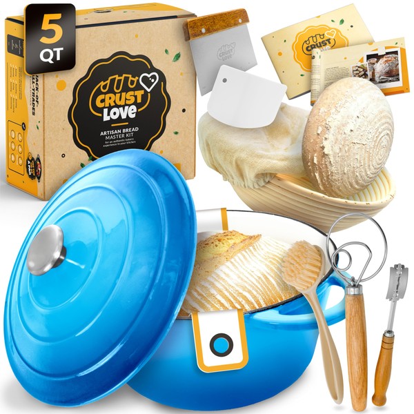 - ALL YOU NEED - The blue enamel Cast Iron Bread Oven comes with a Bread Proofing Basket, a Silicon red dutch oven Sling, a Scoring Lame, a Dough Whisk and much more... It also includes a Booklet with receipes (EN+ES)