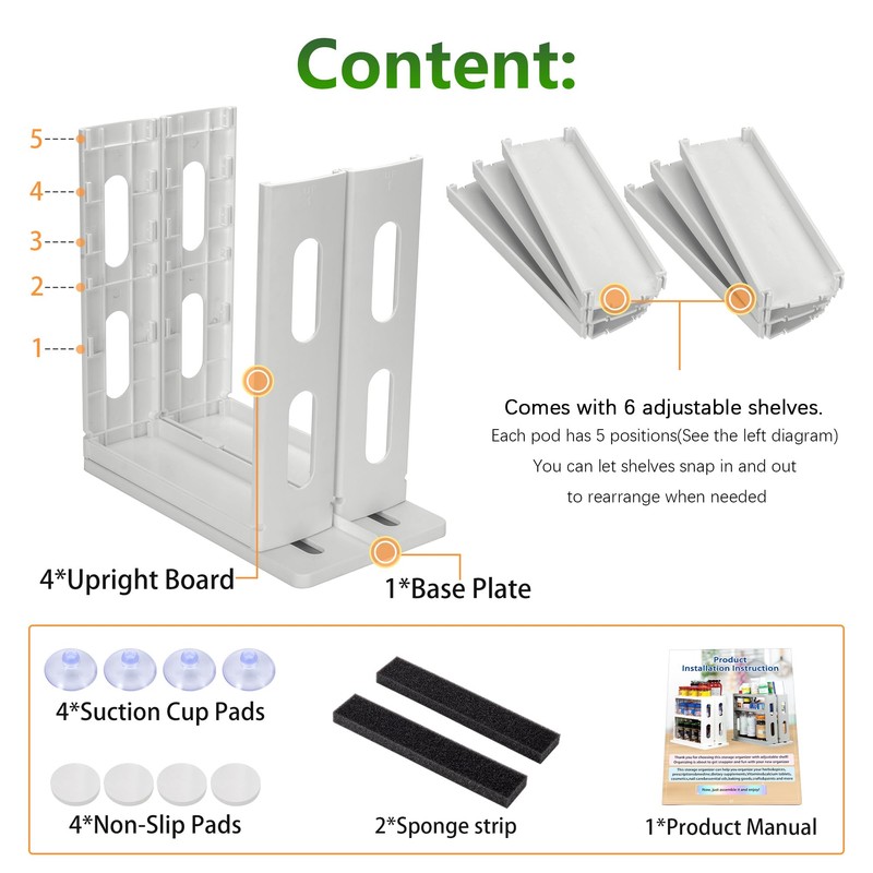 • 【⚠️MEASURE BEFORE YOU BUY! 】Total Size: 10.8"H x 5.8"W x 10.4"L; ⚠️Can put in max size of bottle: 2.625 diameter, heights vary due to adjust; If you plan put the shelf rack into cabinet, ⚠️your cabinet must have a minimum of 10.6” deep X 11” tall for a proper fit. If you have more height cabinets, you can adjust the shelves to the top location and items stored can sit safely peeking out over the top.There are 4 suction cup pad and 4 anti-slip gasket (⚠️please remenber to peel off the film on the gasket surface when use), you can use either of it.