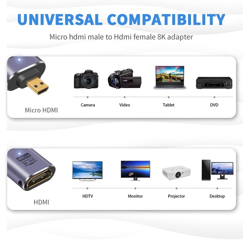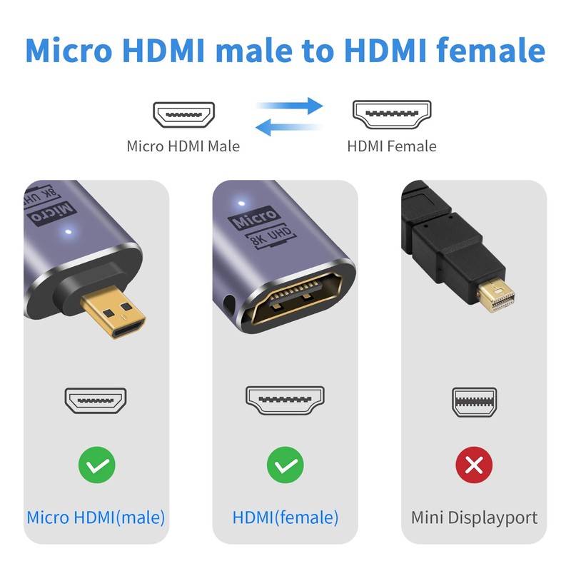 - The 8k Micro HDMI to HDMI adapter can be used to connect a Micro HDMI interface (Micro HDMI) to a standard HDMI interface. (Note: this is a micro HDMI male to HDMI female, please make sure this is a micro HDMI port on your device)