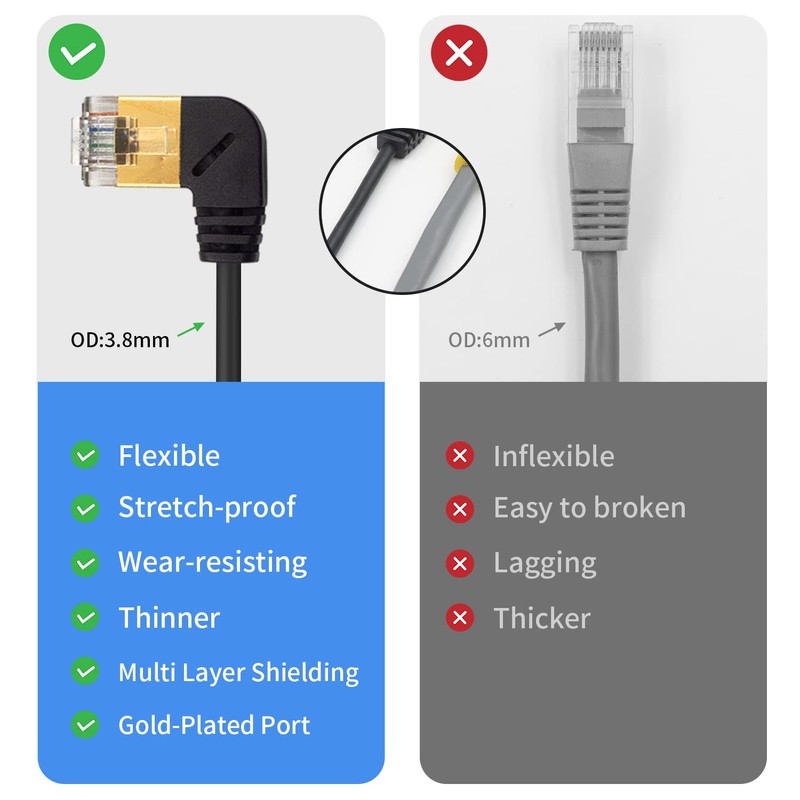 • The Cat8 90 degree ethernet adapter cable is soft, OD: 3.8mm, and ordinary Ethernet Cable: OD: 6mm. More flexible than the standard version.
