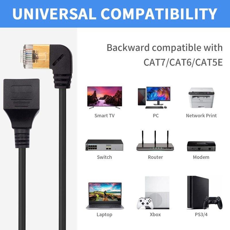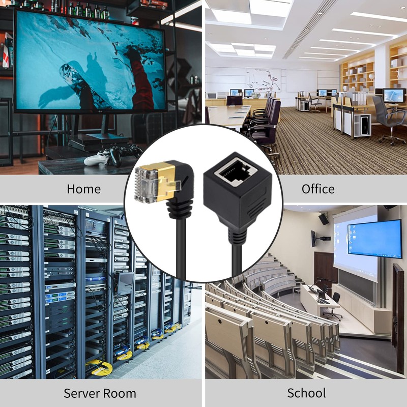 • Ethernet cable 90 degree extension widely compatible with: PCs, Computer Servers, Printers, Routers, Switch Boxes, Network Media Players, NAS, VoIP Phones, PoE Devices, Hubs, DSL, xBox, PS2 and PS3, etc. At the same time, it can be used for connection in conference rooms or classrooms.