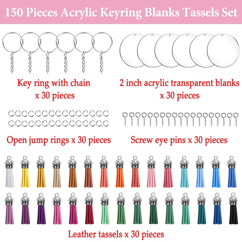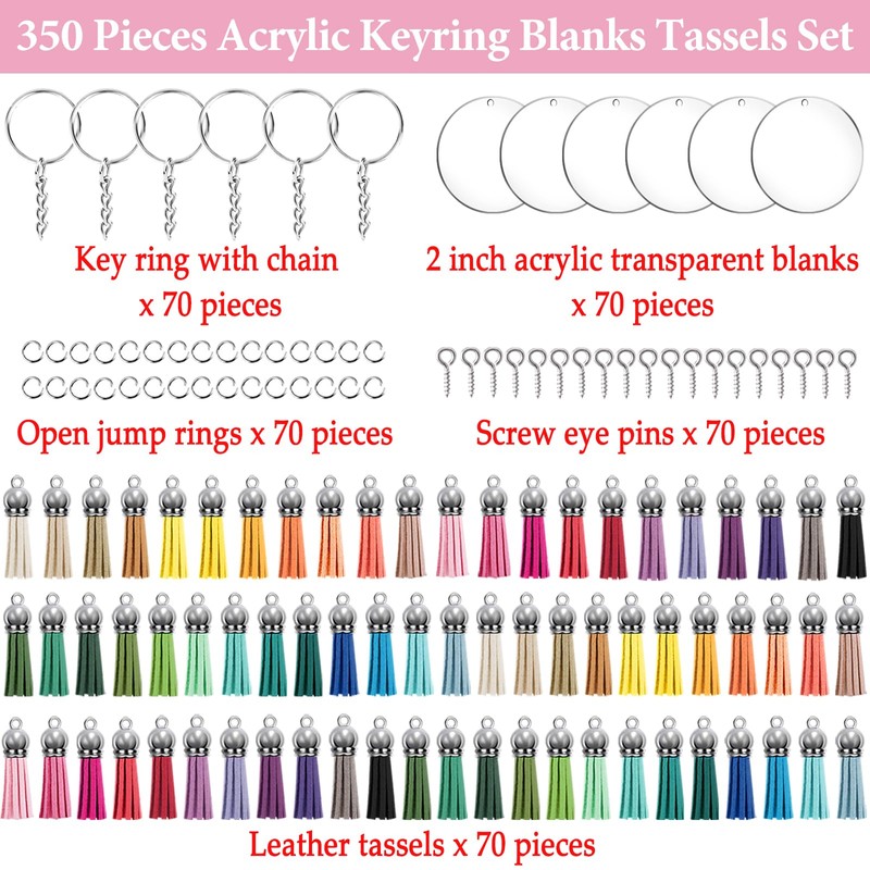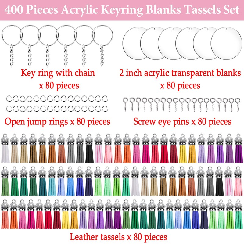 - DIY keychain set - The package contains 80 round acrylic keychain blanks, 80 key rings with extension chain, 80 multi-coloured keychain tassels, 80 open rings and 80 screw eyelets, total 400 pieces, sufficient for DIY keychain crafts.