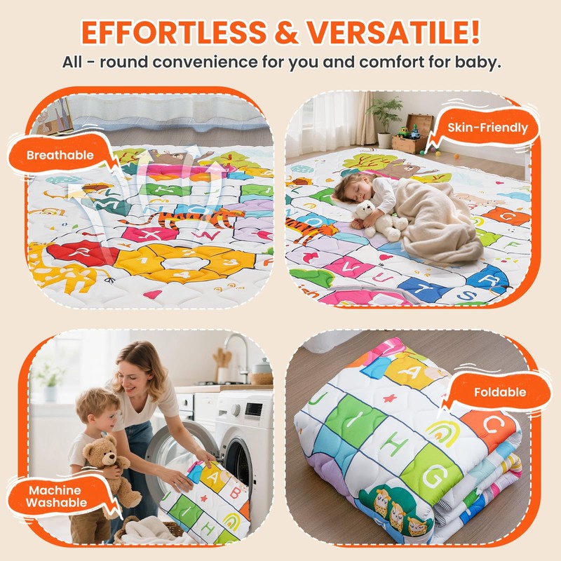 - Soft & Secure Surface: Engineered with premium padding of an ideal thickness, our baby floor mat strikes the perfect balance. It cushions your little one from hard floors, reducing the risk of bumps and bruises, while providing just the right amount of firmness to support crawling, sitting, and early steps. This ensures a safe environment where your baby can practice motor skills without sinking into overly soft surfaces.