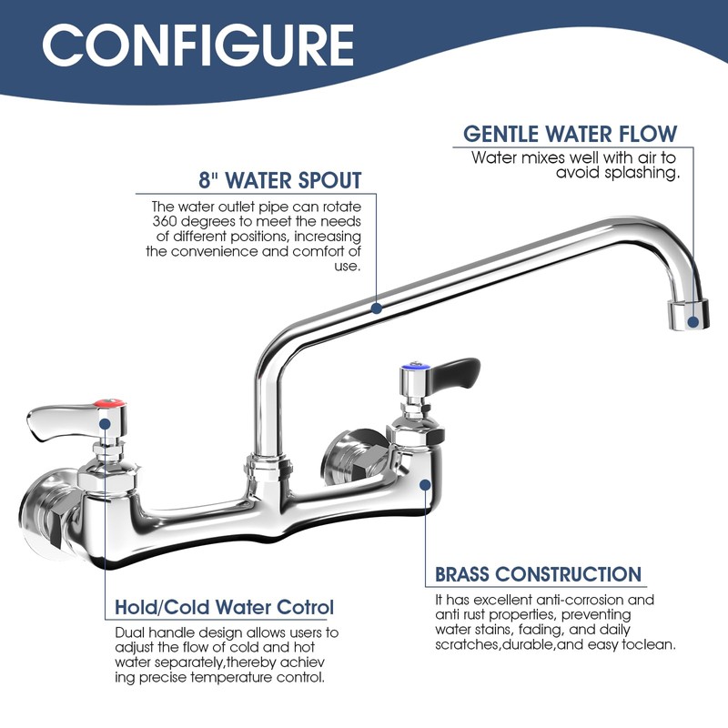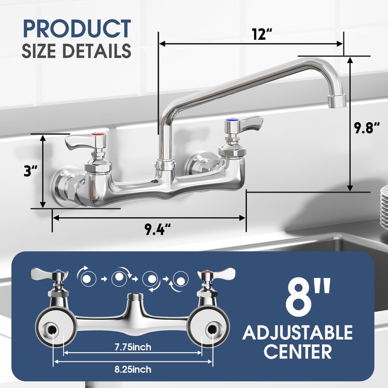 - 【Commercial-Grade Faucet with 8 Inch Center】 This wall mount faucet fits standard 8" center setups and mounts securely above stainless steel, utility, or compartment sinks in kitchens, laundry rooms, or food trucks.