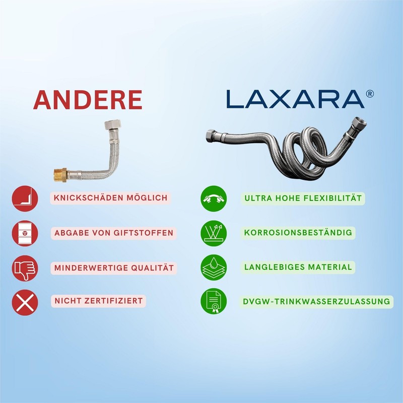 Get the ultimate solution for your water connection needs with our robust flexible hose. This high-quality flexible hose is equipped with a stainless steel mesh that gives it exceptional robustness and makes it corrosion and pressure resistant. The LAXARA water hose is not only flexible, but also impressively pressure resistant up to 10 bar. It can withstand temperatures of up to +90°C, making it versatile. For a precise determination of the required length, simply measure the distance between your water source (angle valve) and that to the connected device and add about 20% to ensure the drinking water hose is exposed and leaks are avoided.