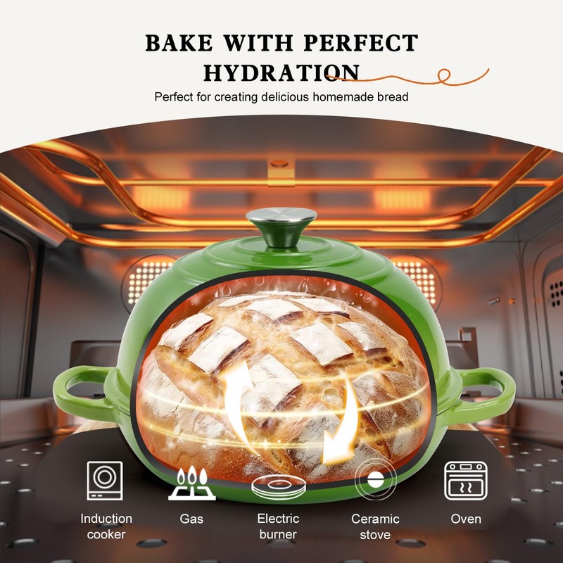 - All-in-One Cooking Companion:Works on all heat sources: gas, induction, electric stovetops, and ovens (heat-safe up to 500°F/260°C). Sear, braise, bake, or simmer effortlessly – perfect for whole chicken, sourdough bread, paella, or tomato sauce (acid-resistant enamel won’t react with food).