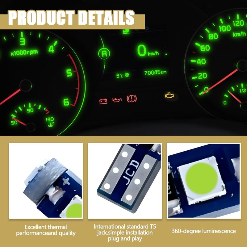 - [Application] : This replacement light dash lights be used for most car interior lights, Including dashboard lights, indicators, engine inspection, ignition lights, side lights, indicators, maps lights, trunk lights, doors lights, etc. The package includes 12pcs of T5 37 74 LED bulbs,enough for your daily replacement.