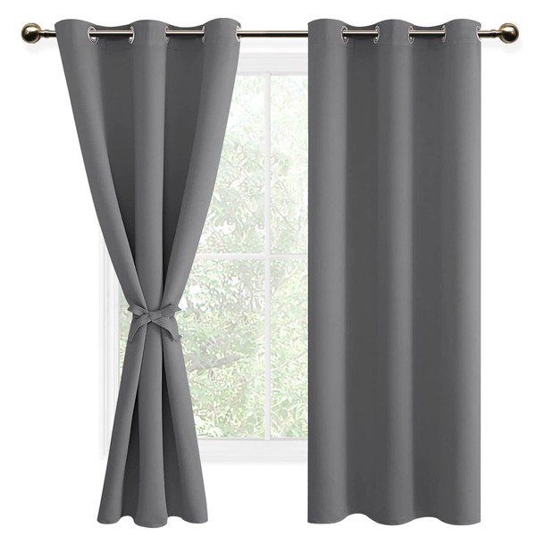 DWCN Grey Blackout Curtains for Bedroom, 42 x 63 Inch Length, Room Darkening Thermal Insulated Grommet Top Window Curtains for Living Room with Tiebacks, Grey, 2 Drape Panels
