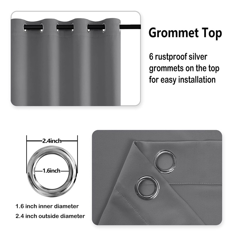 - Package Includes: 2 blackout curtain panels, each panel measures 42W X 63L inches, featuring 6 rust proof silver grommets on the top for easy installation and sliding (diameter is 1.6 inch).