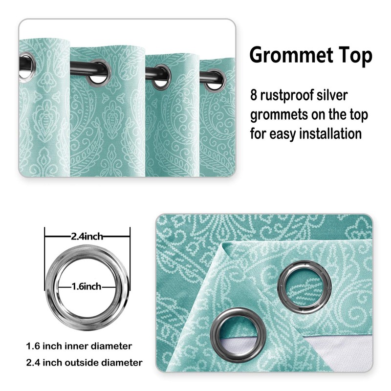 - Your package will include 2 gradient damask blackout curtains, each curtain panel measures 52 x 63 inches. 8 sliver grommets (1.6-inch inner diameter) of each panel make the curtains easy to install and slide and suitable for most standard rods in the market.