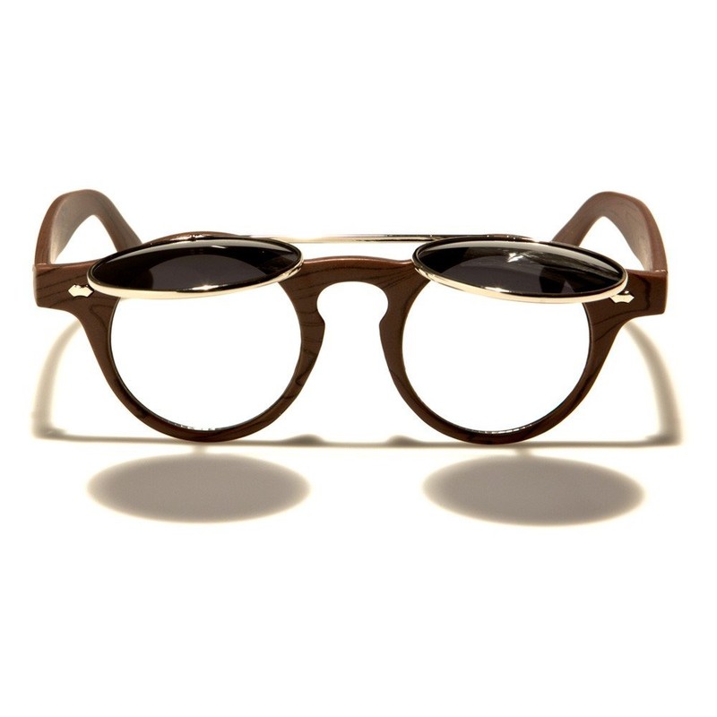 Dweebzilla Faux Wood Frame Round Flip Up Sunglasses (Dark Brown Wood Frame, Black Smoke)
