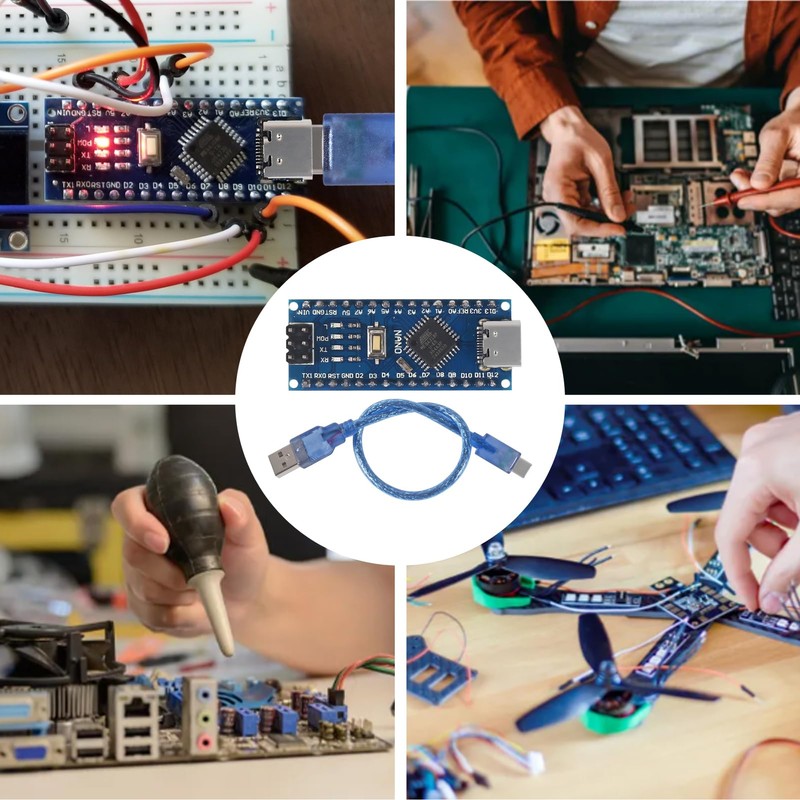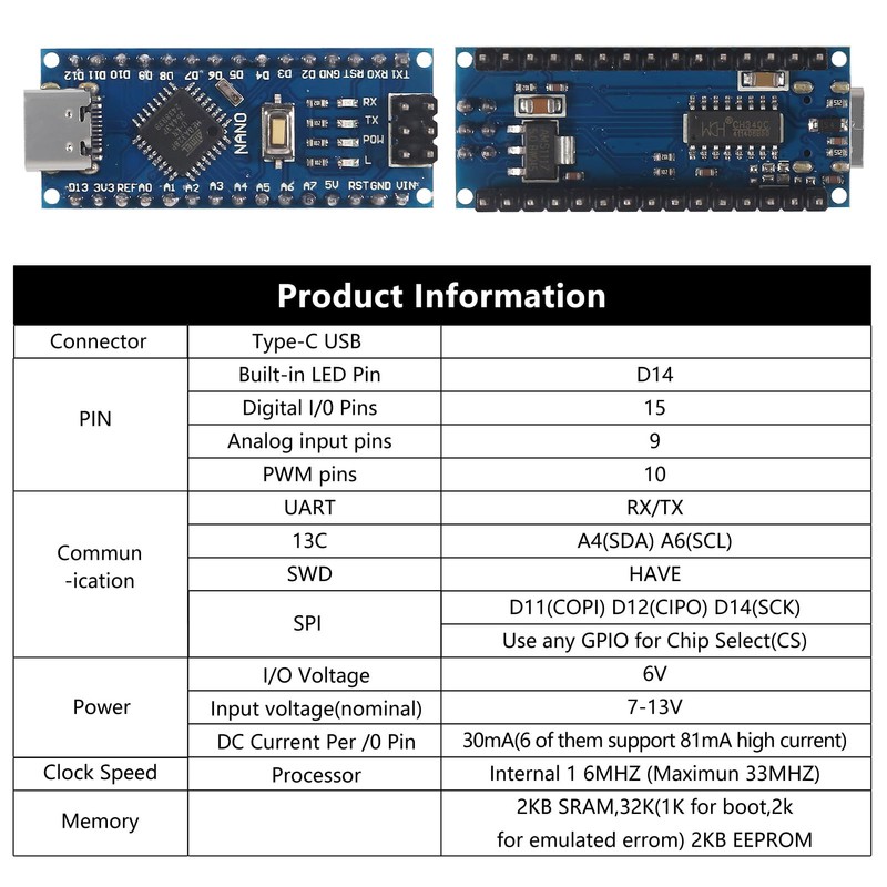 - Nano V3.0 Board with Cable, Nano Board ATmega328P, CH340G Chip 5V 16M, Microcontroller (USB C Port); It is designed for beginners to get started with microcontrollers. This board especially is breadboard friendly is easy to handle the connections.