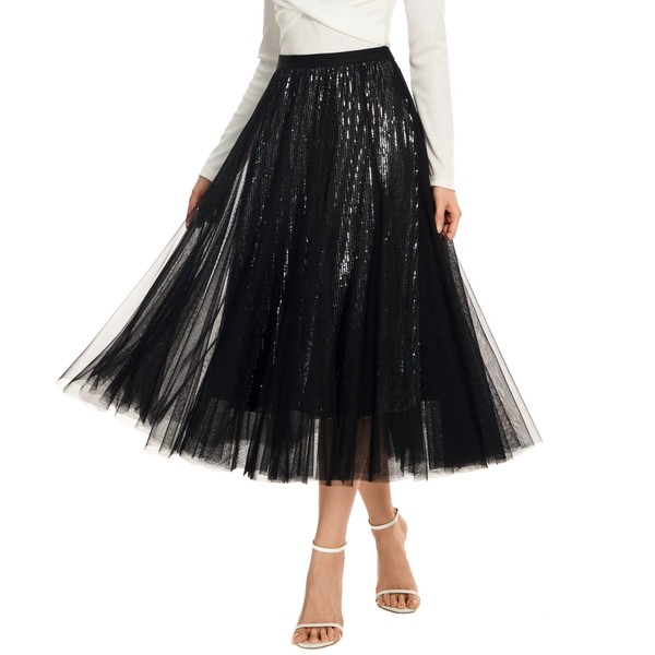 Dwirapal Sequin Long Tulle Skirt Layered Flowy Fairy Sparkle Party Mesh Tea Length Big Hem Skirts for Women