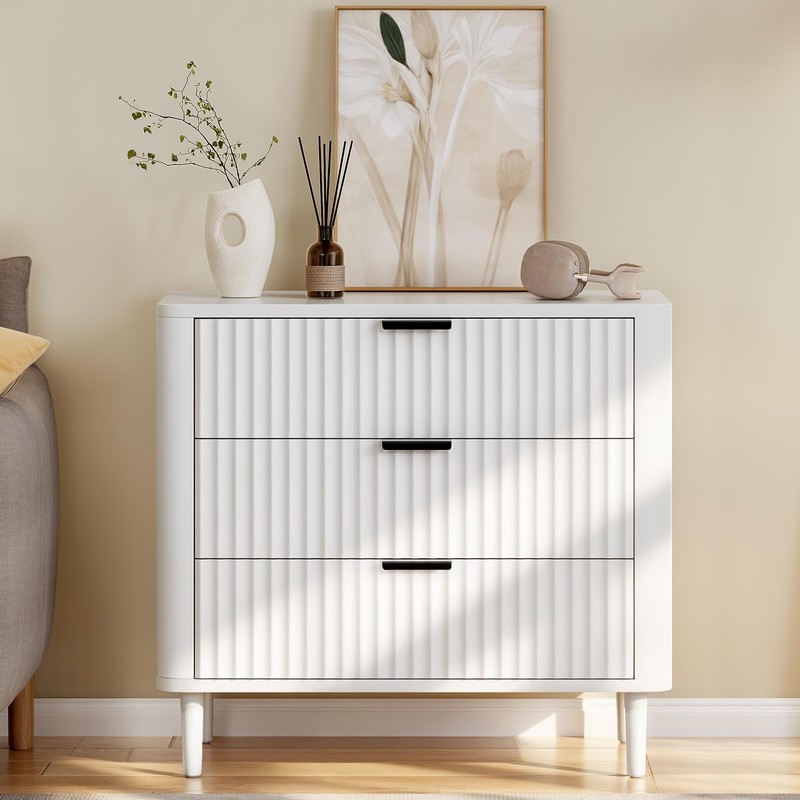DWVO 3 Fluted Drawer Dresser, 32.5 Wider Modern Dressers Chest of Drawers with Solid Wood Legs, Wood Storage Dresser Organizer for Dorms, Flats, Living Rooms, Hallways, White