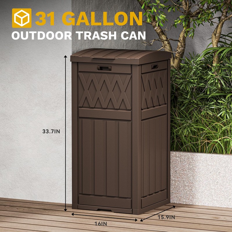 - Spacious and Sleek: Sized at 16.02''L x 15.94''W x 33.66''H to accommodate 33-39 gallon garbage bag, our trash can is perfect for both indoor and outdoor use; Sleek design adds a touch of elegance to your patio, garden, porch, backyard, or deck while keeping trash neatly contained