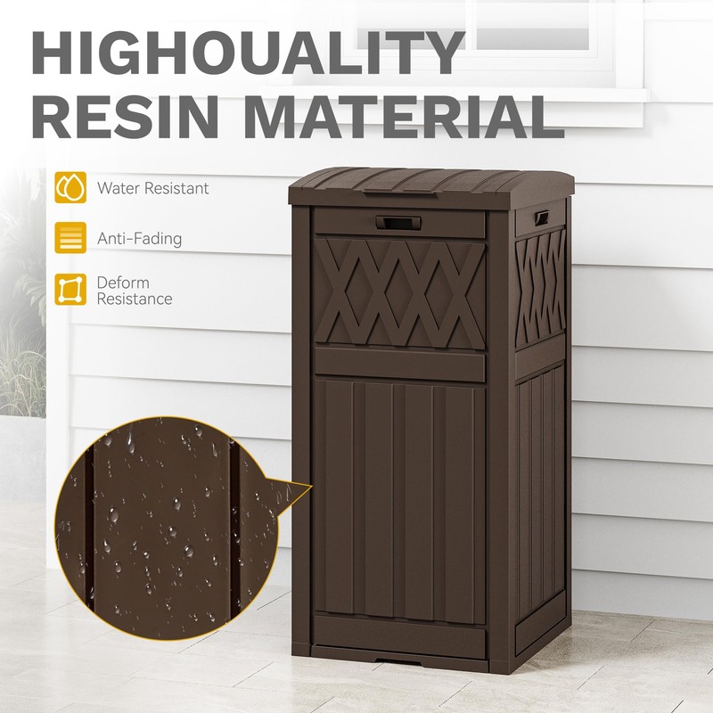 - Weatherproof Construction: This trash can with lid is made from sustainable and sturdy resin material for durability; It provides effective protection against water, fading, bending, and various weather conditions