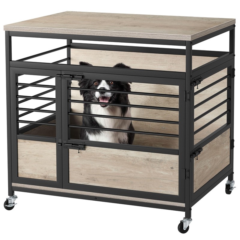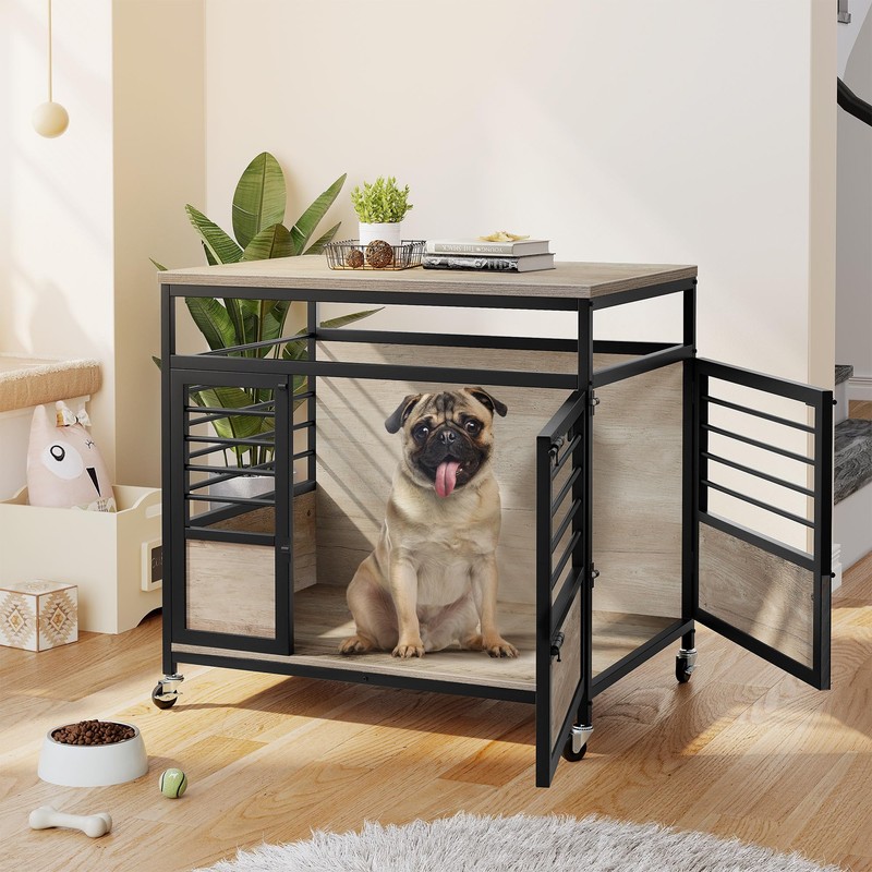 DWVO Dog Crate Furniture, 32 Inch Dog Kennel Indoor Furniture End Table Dog Crate for Dogs, Modern Decorative Dog Crate Wooden Dog Crate Furniture with Wheels, Chew-Resistant, Grey