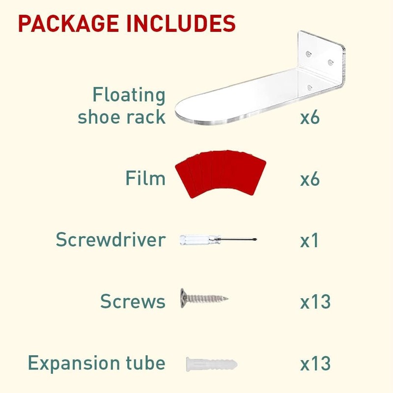 - Easy Operation The floating shoe rack is easy to install. The kit comes with 13 Phillips screws, expansion tube and 6 bands. Each compartment is fixed with two screws or glued to the wall with a film (Note: after using the film, you need to wait 24 hours before placing the shoes).
