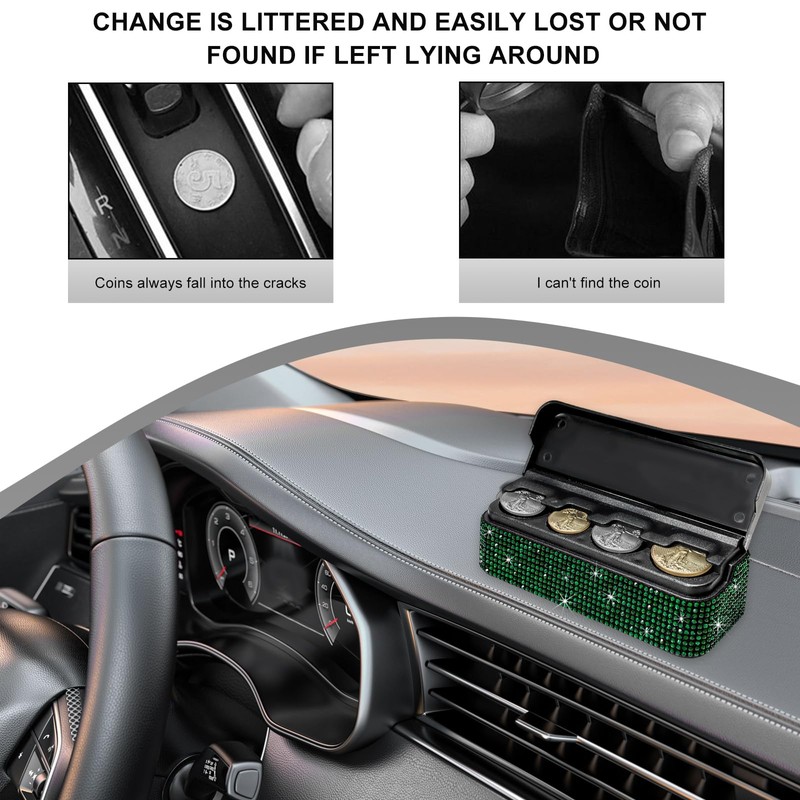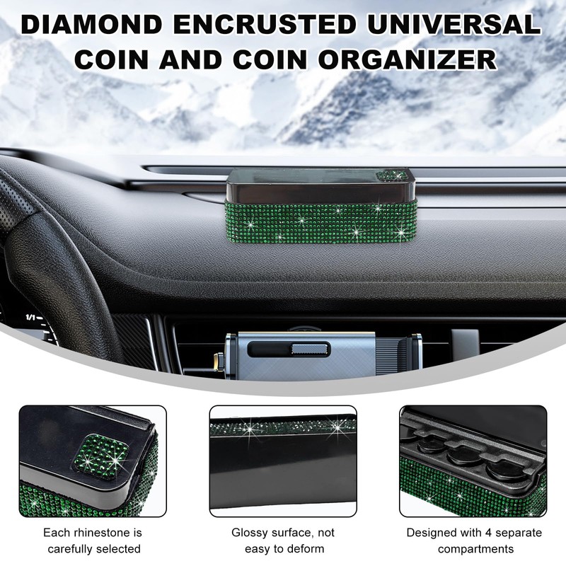 DXNQ Bling Coin Holder for Car, Sparkling Rhinestone Vehicle Coin Oraganizer with 4 Compartments, Portable Crystal Car Storage Coin Money Dispenser, Car Coin Change Organizer Accessory (Green)