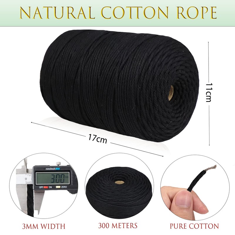 DXRPO Macrame Yarn 3 mm x 300 m, Natural Macrame, Cotton Yarn Macrame Cord, Cotton Cord Used Wall Hanging, Macrame Hanging Basket, DIY Craft Plant Hanger Boho Decoration, Black