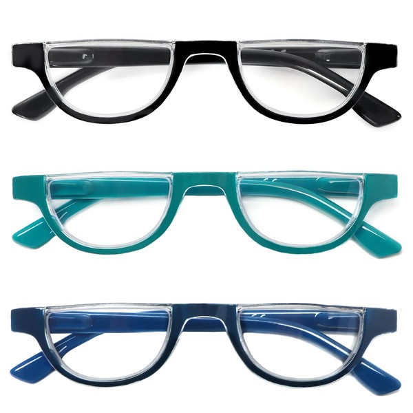 DXYXYO Half Moon Reading Glasses for Women, 3 Pack Small Semi Frame Readers with Spring Hinge Blue Light Blocking, 1.0 Black+green+blue