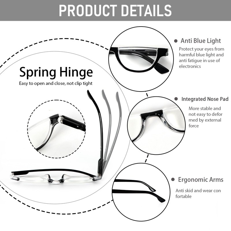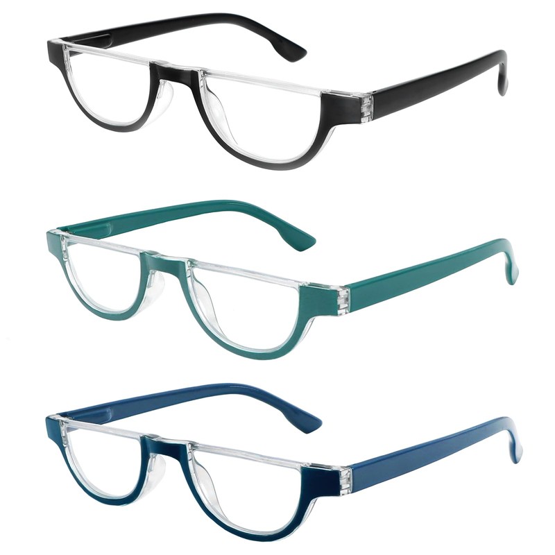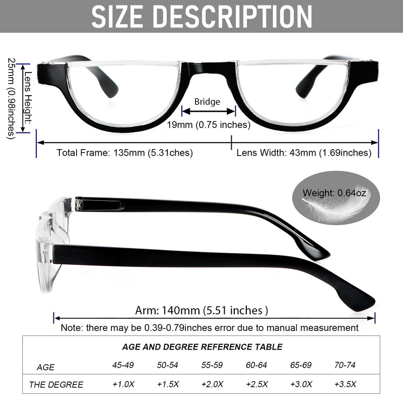 - Half Frame Design: The half moon lens allows you to read directly down the books or phones and look up to the surrounding environment when you need, without having to putting them on and taking them off continuously.