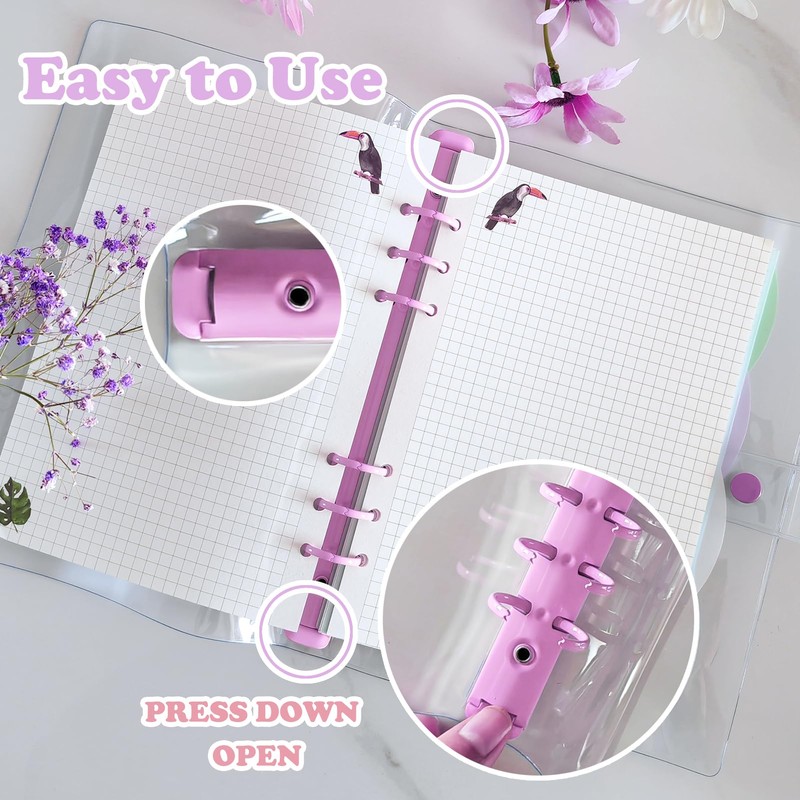 - 2. Product Specifications: ● Package Quantity: 2 pieces 6-Ring round binder cover with snap button closure ● Product size (L x W): 23.7 x17.5cm/9.33 x6.89 inches, A5 size ● Cover Color: transparent, Metal Round Ring Color: Light Purple / White