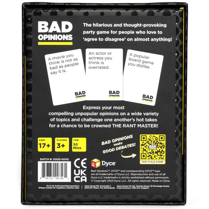 - From the creators of the hilarious party games BAD PEOPLE and BAD CHOICES comes the epic third game in the BAD Series... BAD OPINIONS, the hilarious and thought-provoking party game for people who love to 'agree to disagree' on almost anything!