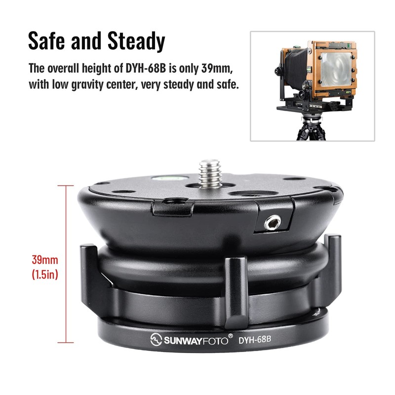 - Safe and steady: The overall height of DYH-68B is only 39mm, with low gravity center, very steady and safe. Compatible with equipment of high gravity center, such as 6x6, 6x7 medium format camera or view camera.