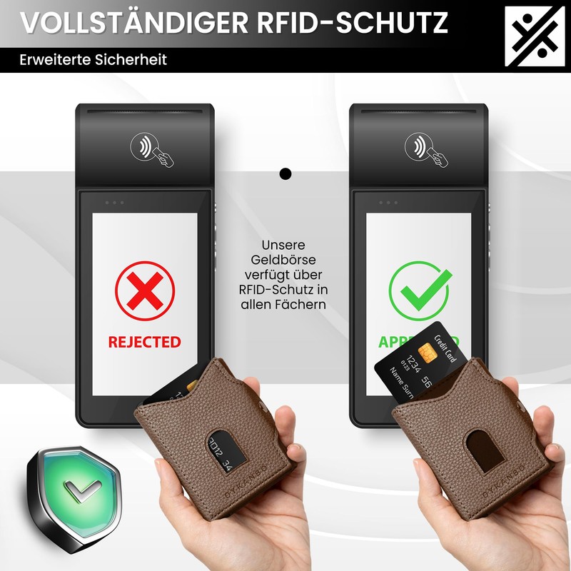 • RFID protection in all compartments. Our RFID wallet protects your cards from unauthorised reading. Thanks to integrated RFID protection in all compartments, this men's credit card holder offers maximum security for your personal data. A must have for the modern man who values privacy.