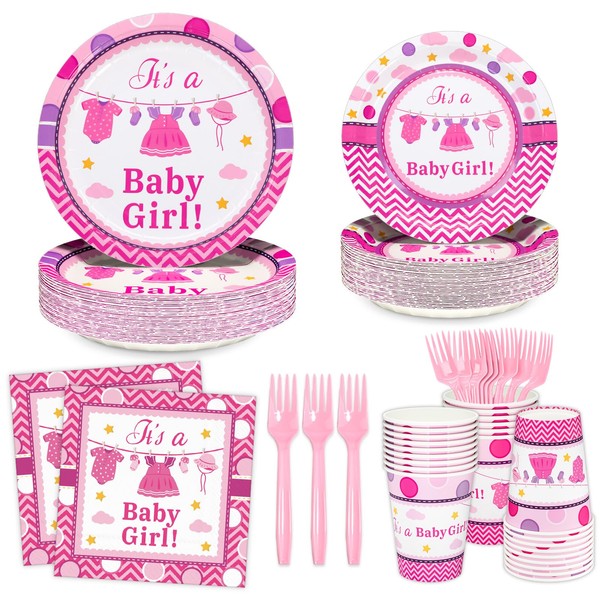 - 【BABY GIRL SHOWER DESIGN】: The main design element of this paper tableware set is the pink baby dress,baby clothes,baby socks,baby hat, and the words "It' a Baby Girl " add a attractive and joyful atmosphere to your baby shower party.