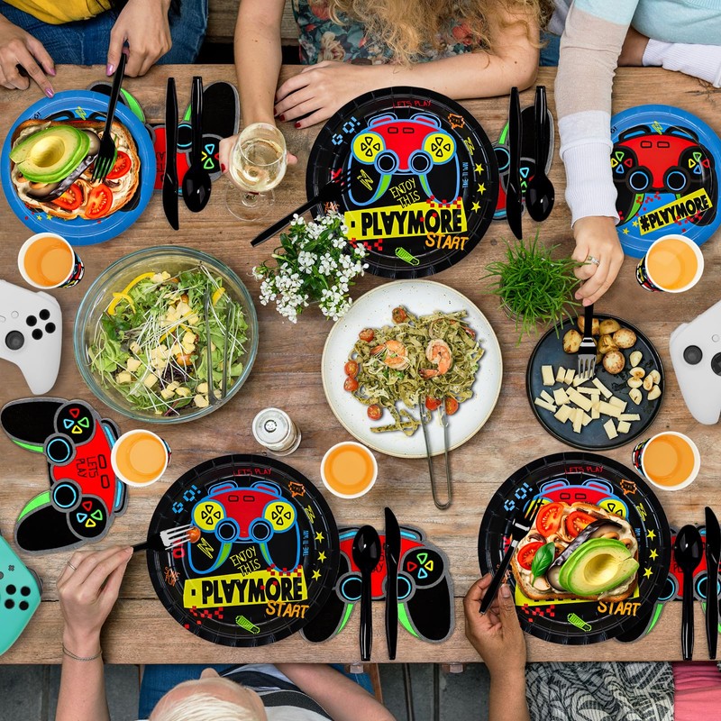 - 🎮【HIGH QUALITY & SAFETY】: Napkins are soft and absorbent. All the paper plates were made of high-quality thick paper that is durable and recycles, environmentally friendly, which is BPA-Free, non-toxic. 100% be safe for kids, a great choice for your children. ✖ Please don't place the plates in the microwave.