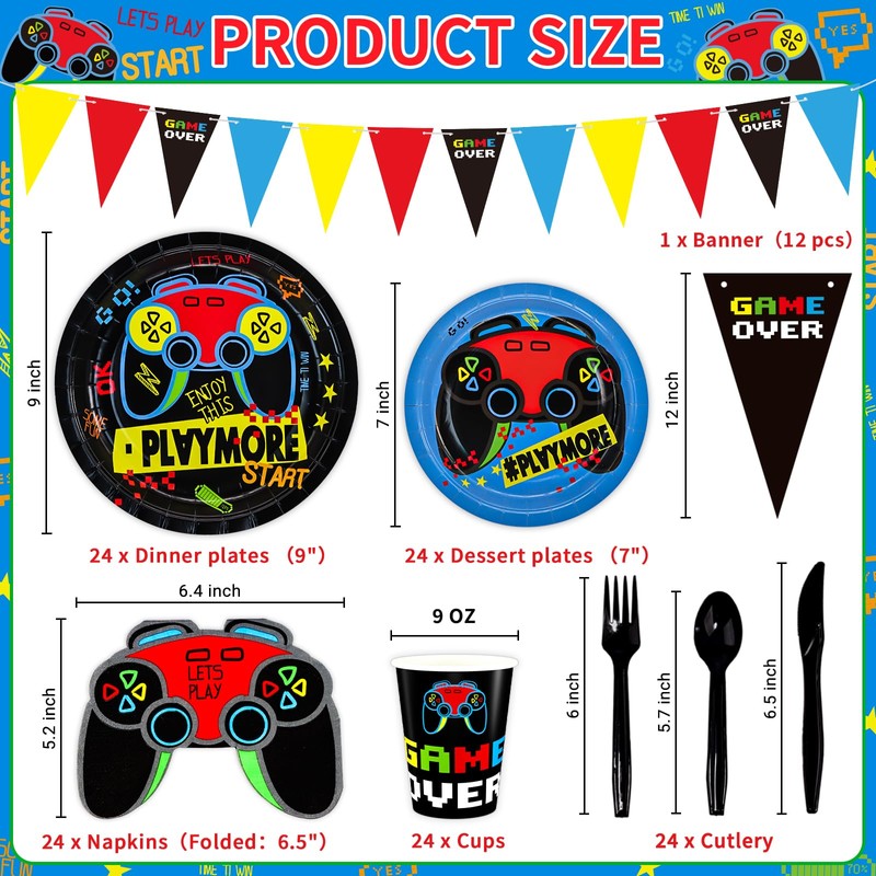- 🎮【 PACKAGE INCLUDE】: It has a total of 180 pcs and it can serve 24 guests. It include 1 pack color pennant banner(12*single flag), 24*paper plates(9 in), 24*paper plates(7 in), 24 napkins(6.5 in), 24*paper cups(9 oz), 24*spoons, 24*knifes, 24*forks.