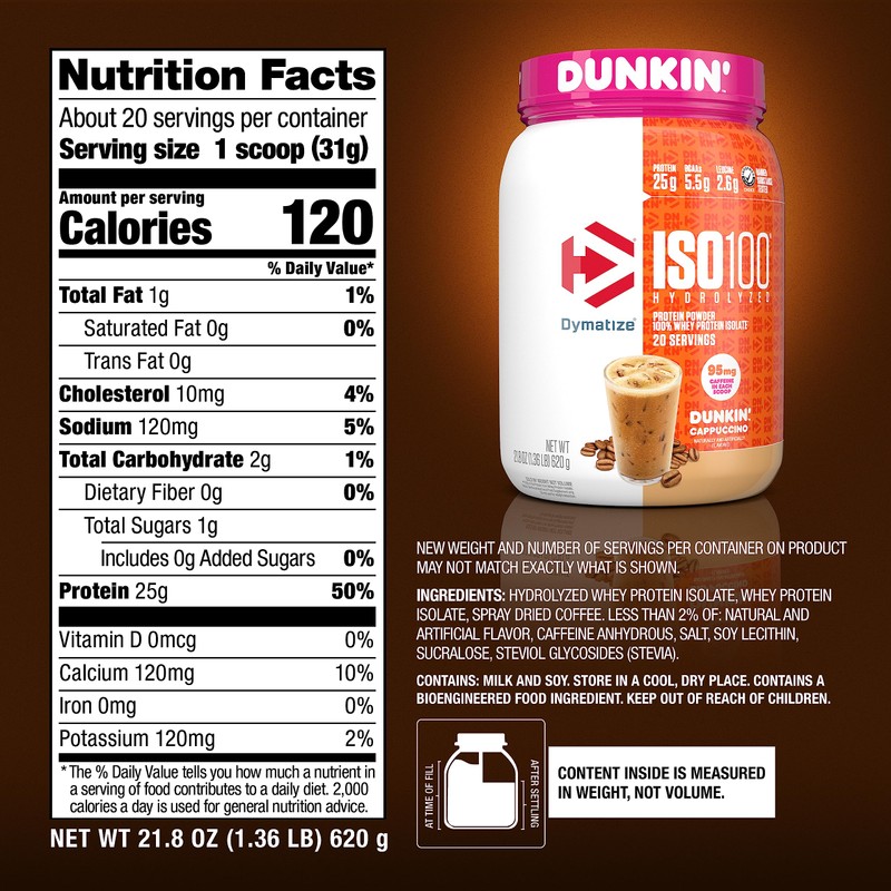 Dymatize x Dunkin' Cappuccino ISO100 Whey Protein Powder, 95mg Caffeine, 25g of Protein, 20 Servings, 5.5g BCAAs, 120 Cal., Gluten Free, 1g Fat, 1g Sugar, 2g Carb