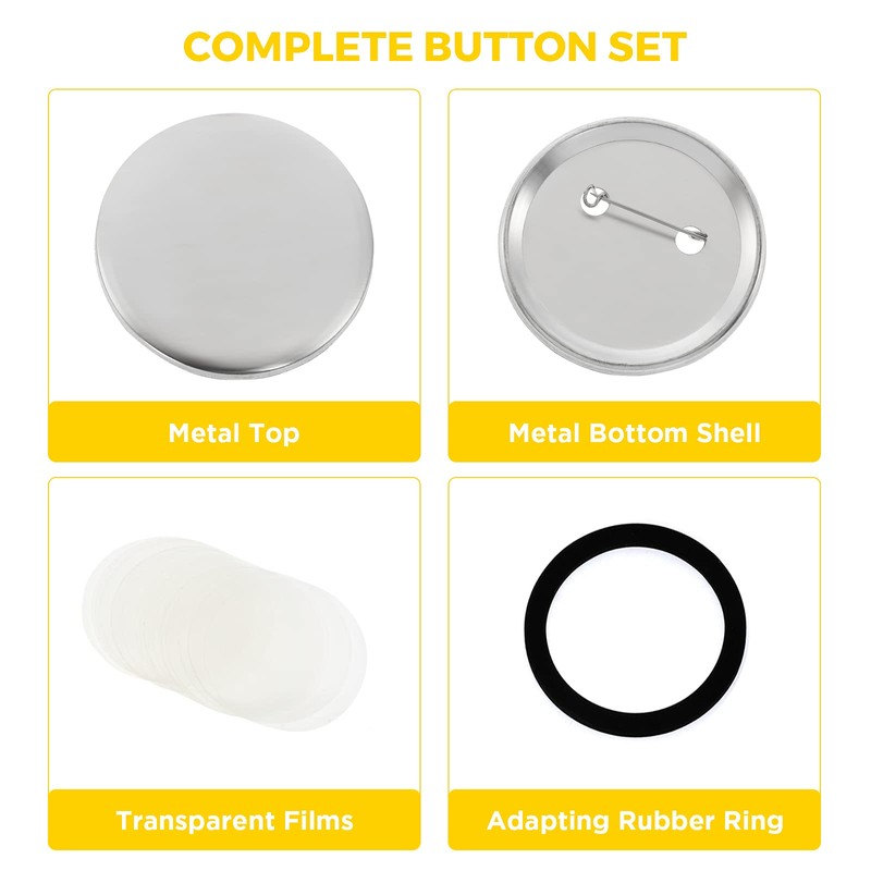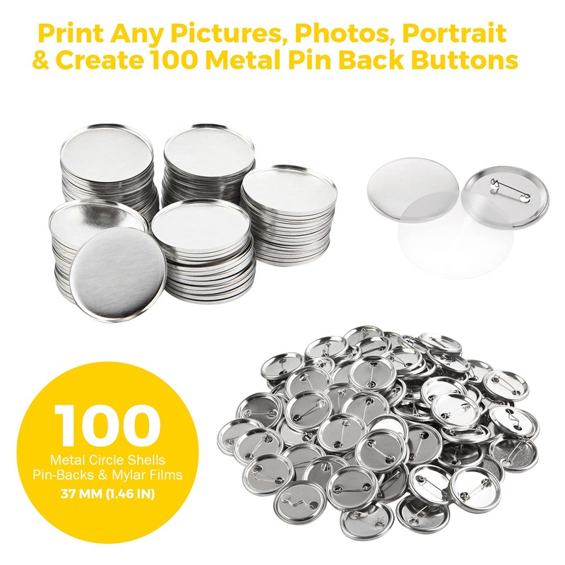- 【PACKAGE INCLUDED】: 100pcs 37mm metal circle badge button shells. 100 metal circle pin backs. 100 pieces mylar. Print any pictures, photos, portraits & create 100 additional metal pin back buttons.machine not included.1 silicone gasket, remember to pad it during the badge making process.
